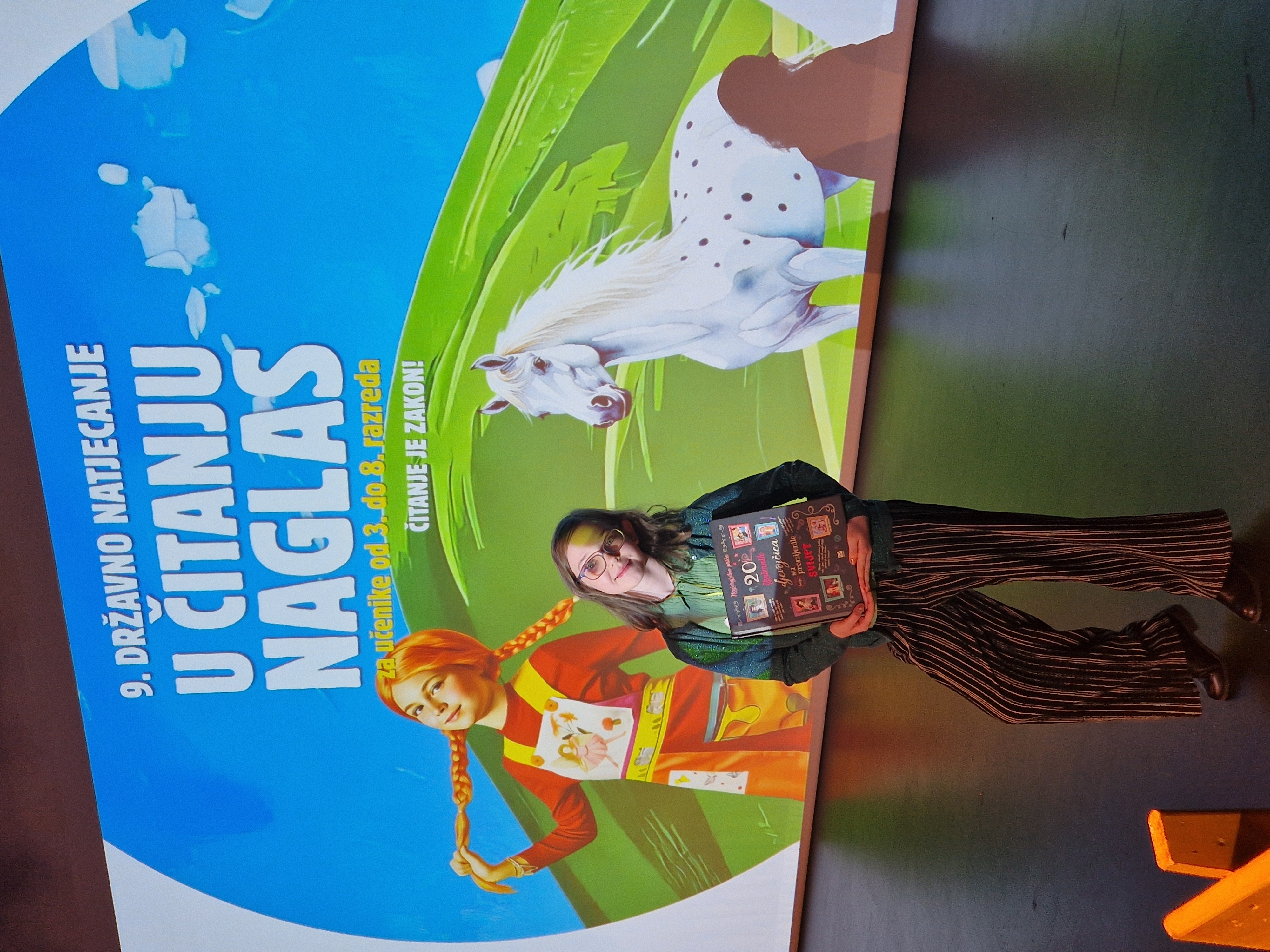 Dana 20. i 21. studenoga 2025. godine u Sisku se održalo 9. državno natjecanje u čitanju naglas. Pobjedom na školskom i županijskom natjecanju, već drugu godinu zaredom, dobila sam priliku sudjelovati na državnom natjecanju koje se prošle godine, nažalost, nije održalo. Deveto državno natjecanje u čitanju naglas organizirala je Narodna knjižnica Vlado Gotovac Sisak. Mi natjecatelji i naši mentori bili smo smješteni u hotelu Panonija tijekom trajanja natjecanja. Prvi dio natjecanja u mlađoj kategoriji, za učenike od 3. do 5. razreda, održao se u Kazalištu 21 u Sisku prvoga dana natjecanja. I ja sam se natjecala u toj kategoriji te sam svoj nastup odradila u prvom dijelu. Bilo mi je vrlo uzbudljivo. Imala sam veliku tremu koja je nestala čim sam, s velikim osmijehom na licu, odlučno i samouvjereno zakoračila na pozornicu. Nisam mogla vjerovati da se sve ovo doista događa baš meni i da upravo ja predstavljam cijelu Međimursku županiju na ovom natjecanju. To mi je bila velika čast, ali i odgovornost. Najprije sam se predstavila, a zatim čitala ulomak o Jane Austen iz knjige 20 iznimnih djevojčica koje su promijenile svijet. Iako sam odradila odličan nastup, ipak nisam bila proglašena među tri najbolje, no nisam bila osobito razočarana. Stekla sam novo iskustvo, upoznala novi grad i nekoliko novih prijateljica s kojima sam ostala u kontaktu. Drugi dan natjecanja za mene je bio opuštajući jer sam sudjelovala samo kao gledateljica. Taj dan bio je rezerviran za stariju kategoriju (učenike od 6. do 8. razreda), pa sam uživala u njihovim nastupima i bodrila Lenu iz OŠ dr. Ivana Novaka Macinec, koja je u toj kategoriji predstavljala našu županiju. Želim zahvaliti svojoj mentorici, učiteljici Ani Marciuš Knezić, koja me vodila kroz natjecanje te učiteljici Aniti Škvorc-Branda na pomoći oko priprema za natjecanje.