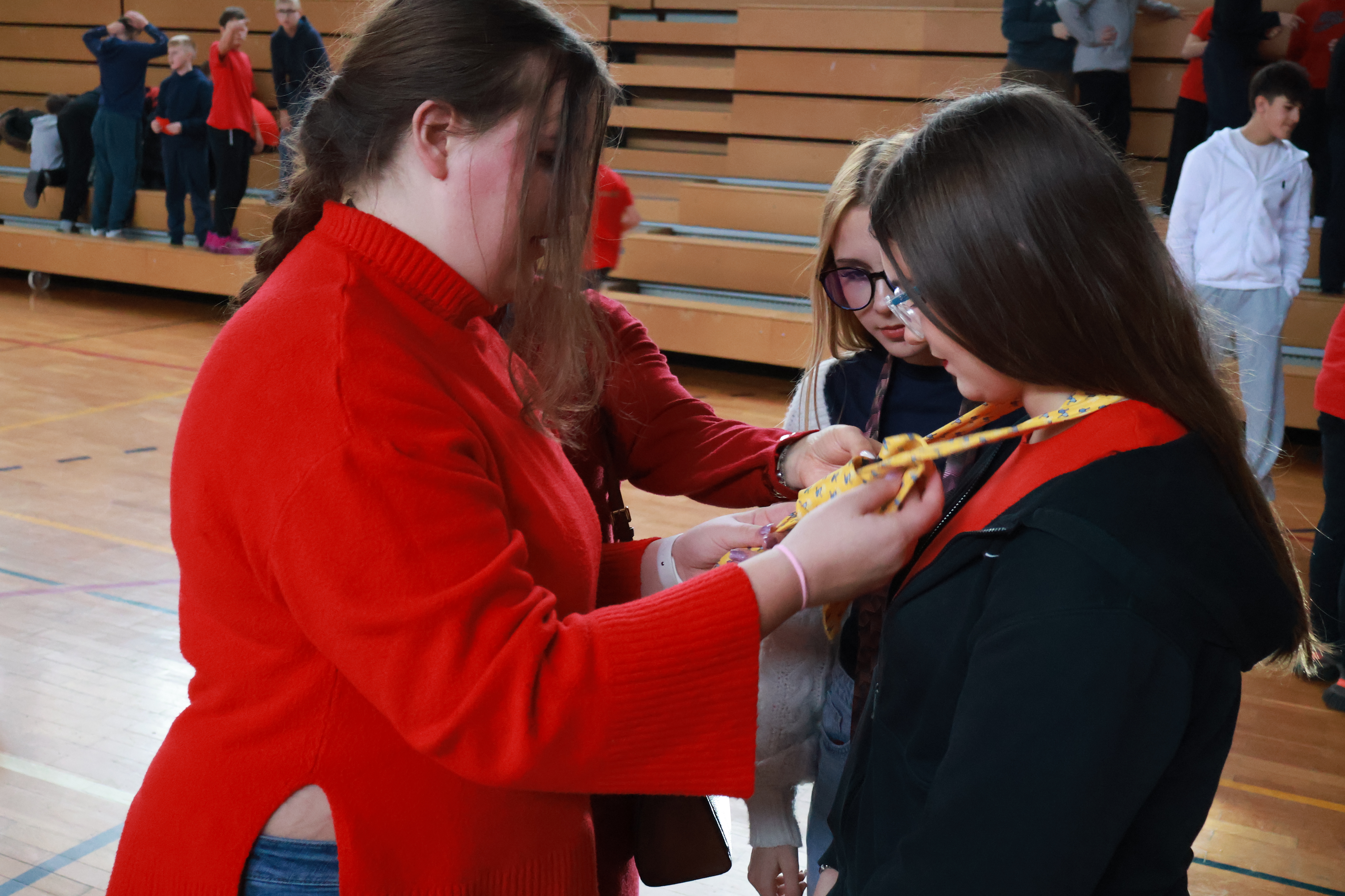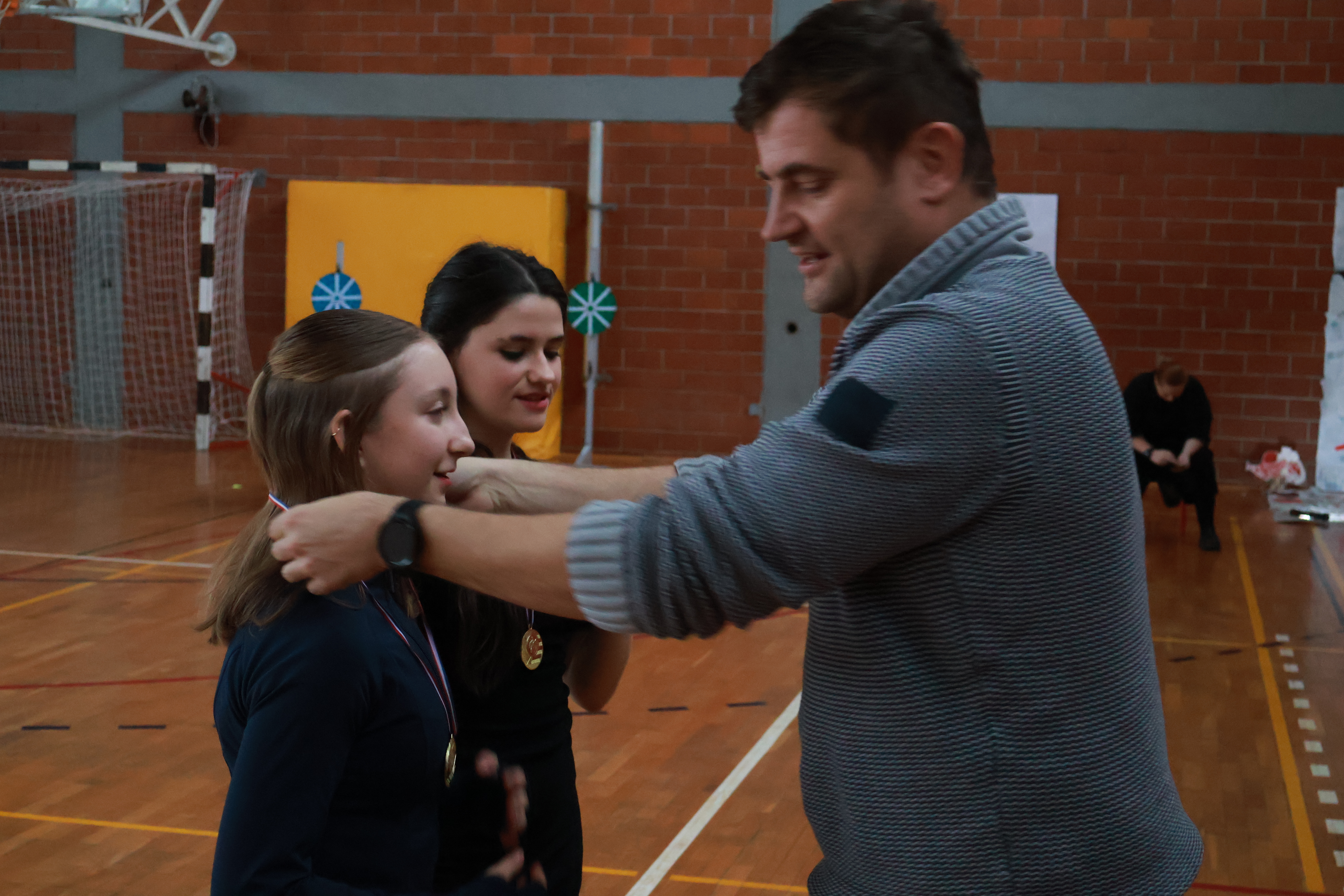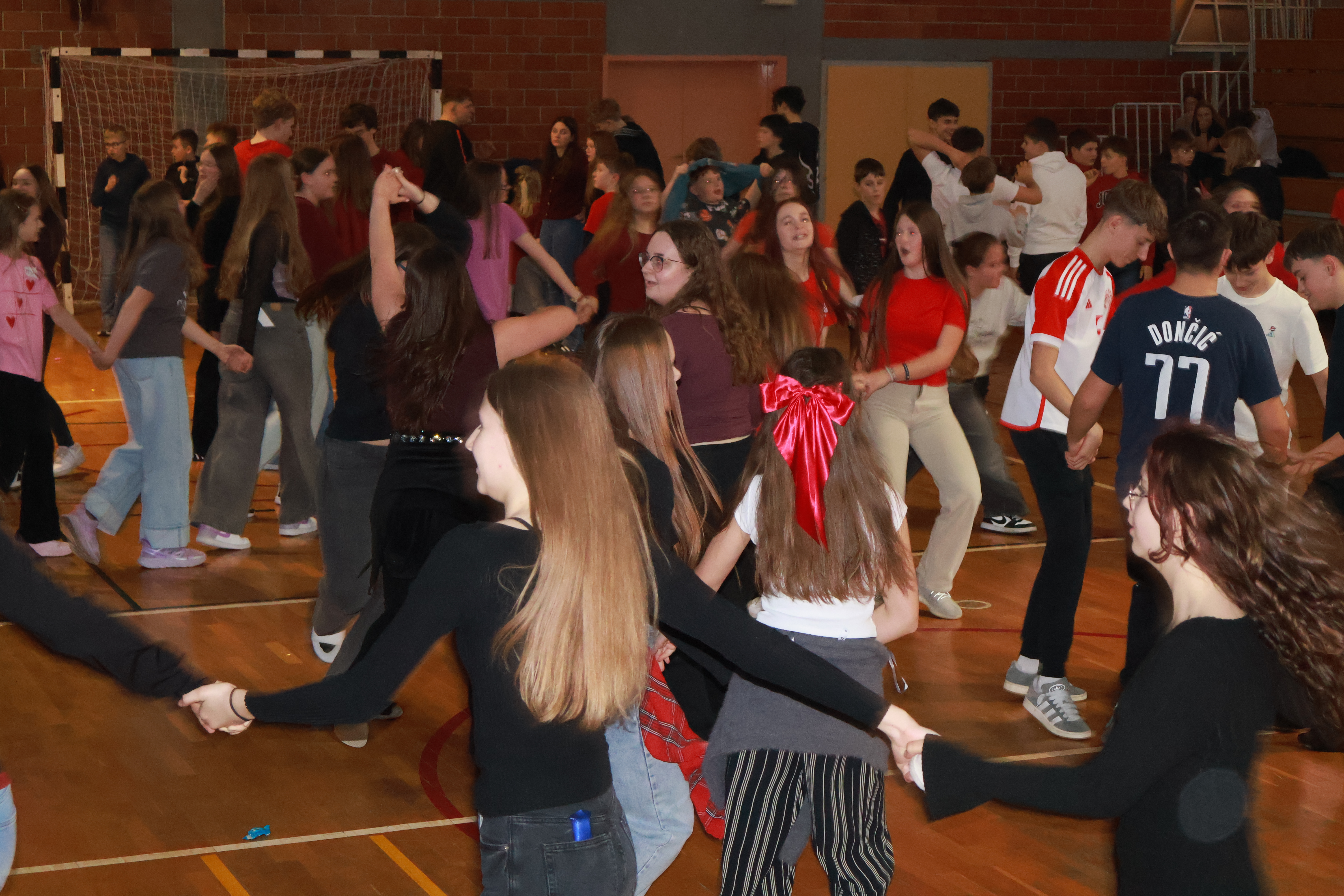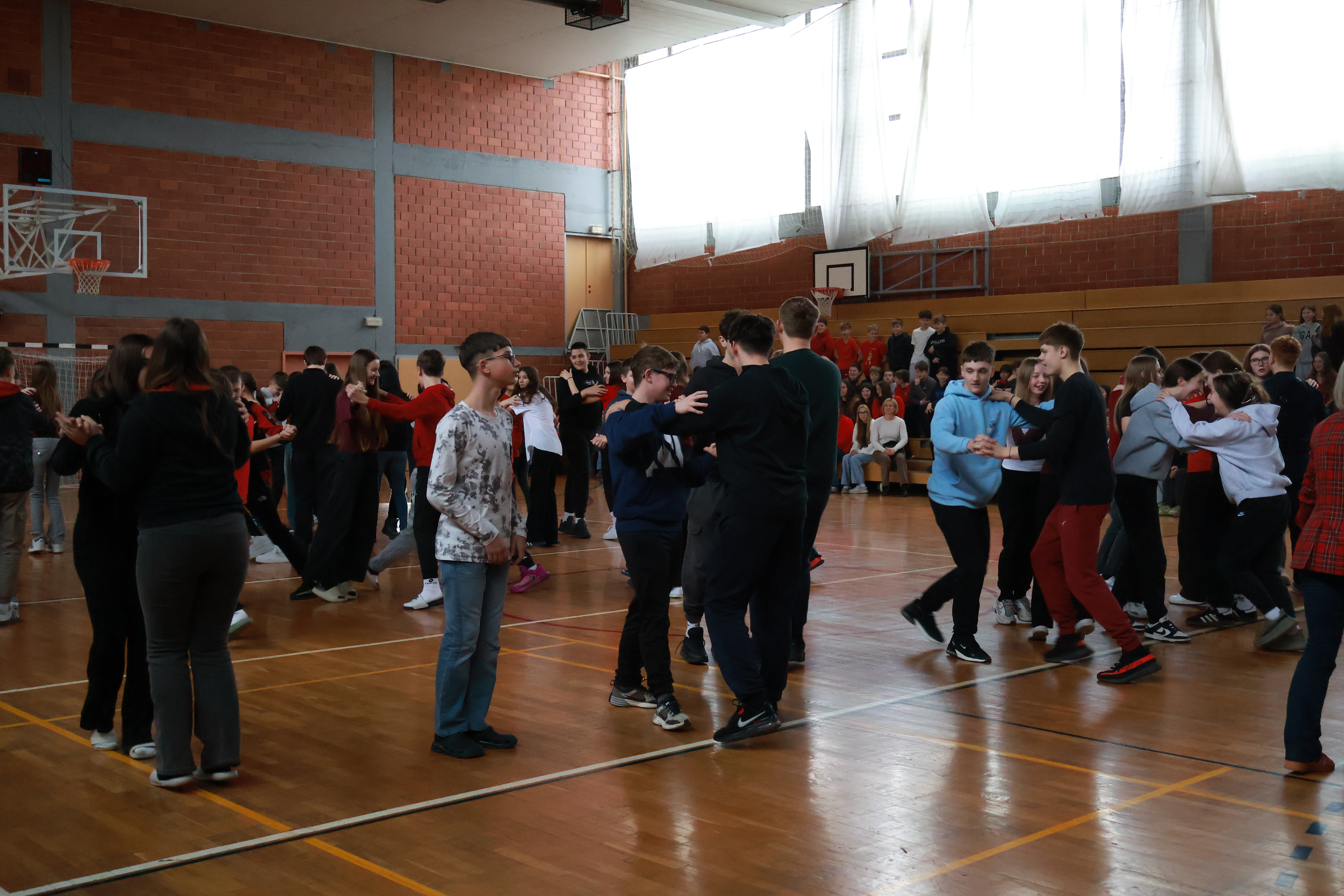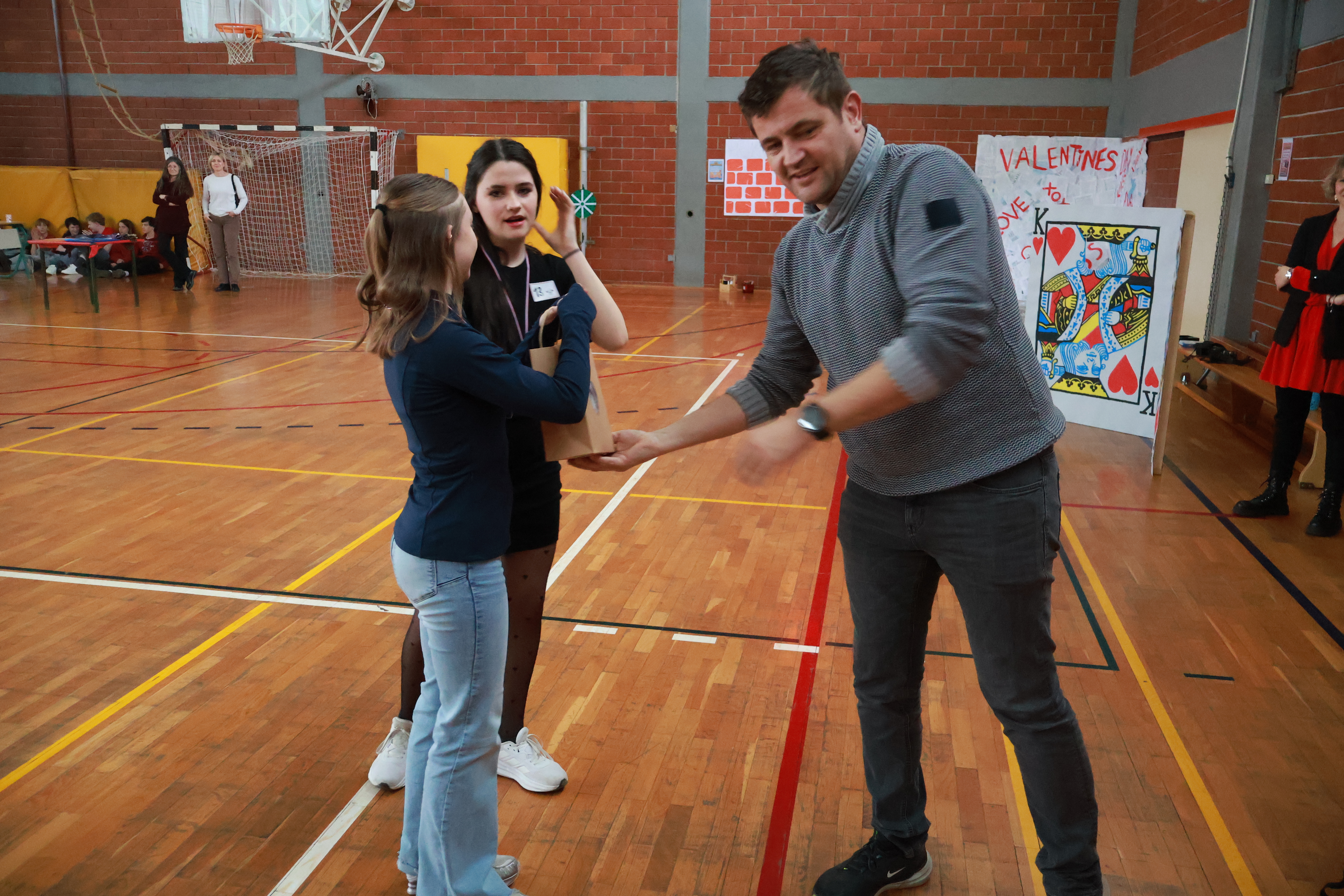 Vrhunac svih priprema održao se u ponedjeljak u školskoj sportskoj dvorani gdje smo u dvosatnom zanimljivom i šarolikom programu nakratko zaboravili sve školske brige i posvetili se slatkim ljubavnim mukama. Obilježavanje Valentinova započeli smo kratkim uvodnim programom u kojem smo više doznali o samom sv. Valentinu, o međimurskim običajima vezanim uz taj dan (ftičeki se ženijo i črlene čižmice) te o tome kako je nekadašnje Valentinovo bilo puno skromnije od današnjih, mahom komercijalnih i materijalnih obilježja. Misao vodilja ovog obilježavanja dana ljubavi bilo je upravo to – vrijednosti koje su se povodom tog dana (ali i cijele godine) njegovale u međusobnim ljudskim odnosima. Nismo kupovali poklone; danas smo željeli jedni drugima darovati svoje vrijeme, pažnju, prijateljstvo, ljubav i zajedništvo. Nakon uvodnog upoznavanja s Valentinovim nekad i danas kroz koje nas je vodila Zola Treska, slijedili su pokazni plesovi 7. i 8. razreda. Bečki valcer, engleski valcer i disco fox plesovi su koje su nam u suradnji s učiteljicom Kristinom Horvat i učiteljem Aleksandrom Puklavcom pokazali naši učenici. Slijedi Ples srca – igra u kojoj smo imali prijavljen zavidan broj plesnih parova. Glazba je svirala i izvlačili su se brojevi, parovi su ispadali. Posljednja tri para koja su najduže ostala na podiju, dobili su simbolične poklone tijekom proglašenja pobjednika. Poklone (poklon bon za pizze i palačinke) im je uručio ravnatelj škole Milan Đurić.
